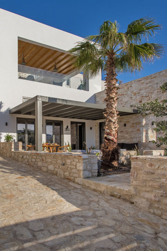 The villa is located on a large property by the sea, at the protected cove of Faragas, on the southern coast of the island of Paros. It is one of the three adjacent villas all constructed according to traditional Cycladic architecture while the interior spaces compine traditional and contemporary elements of style, thus creating an elegant, modern ambience.