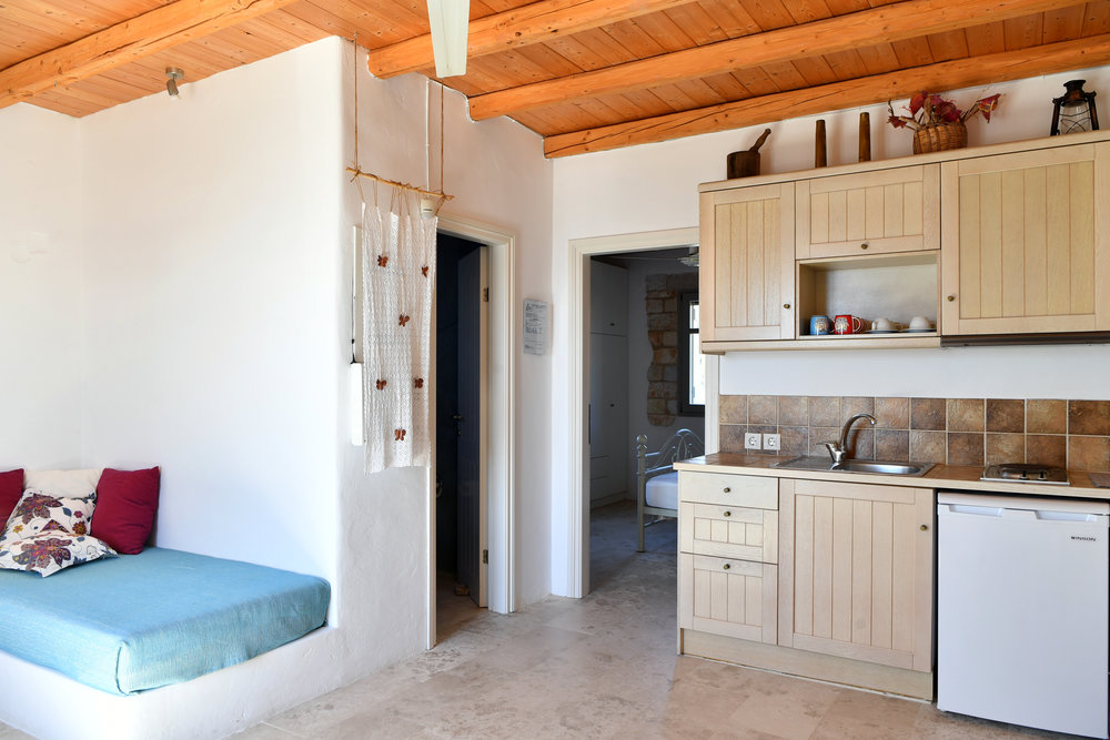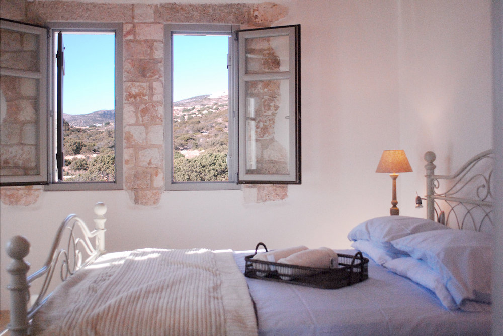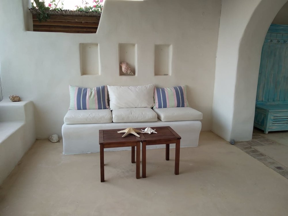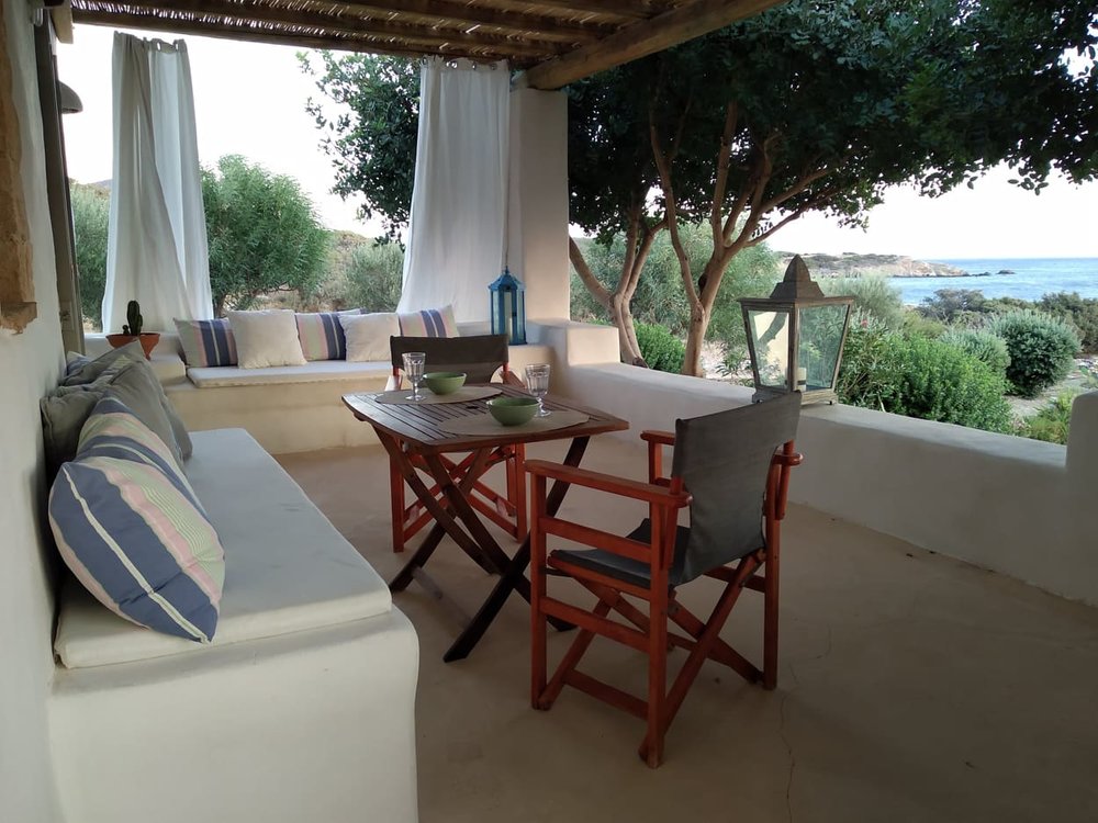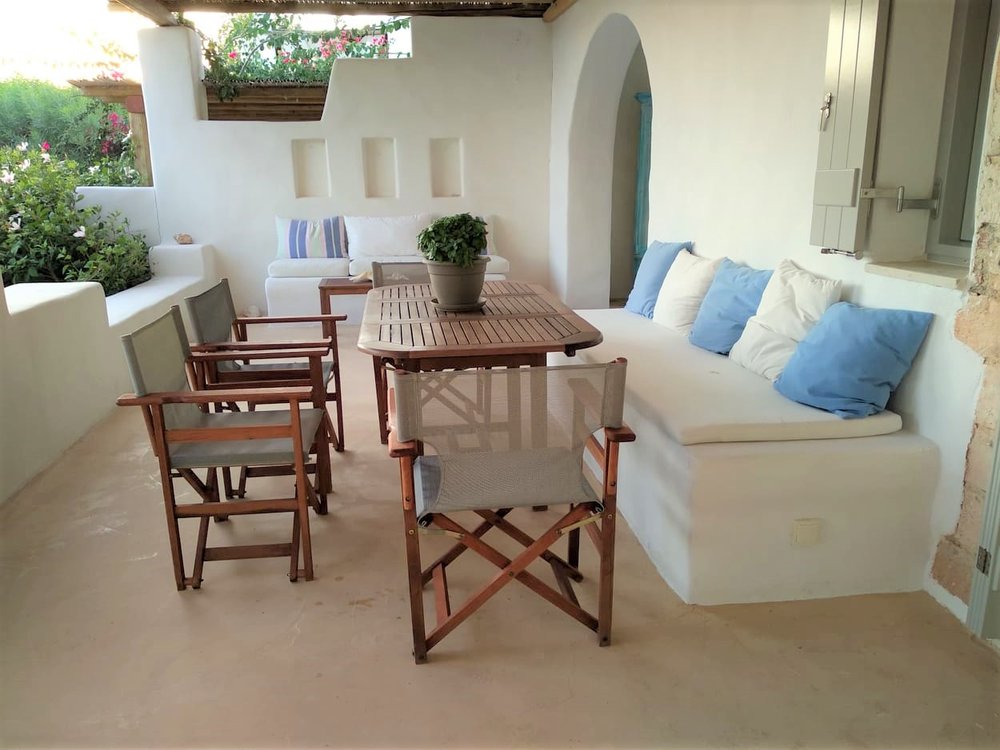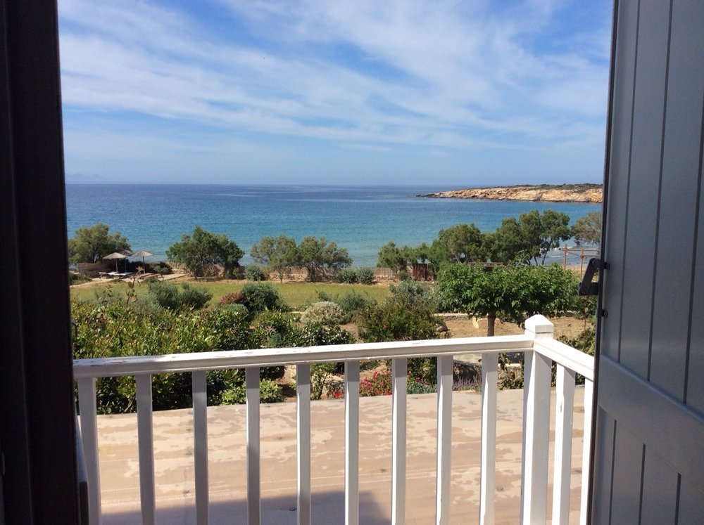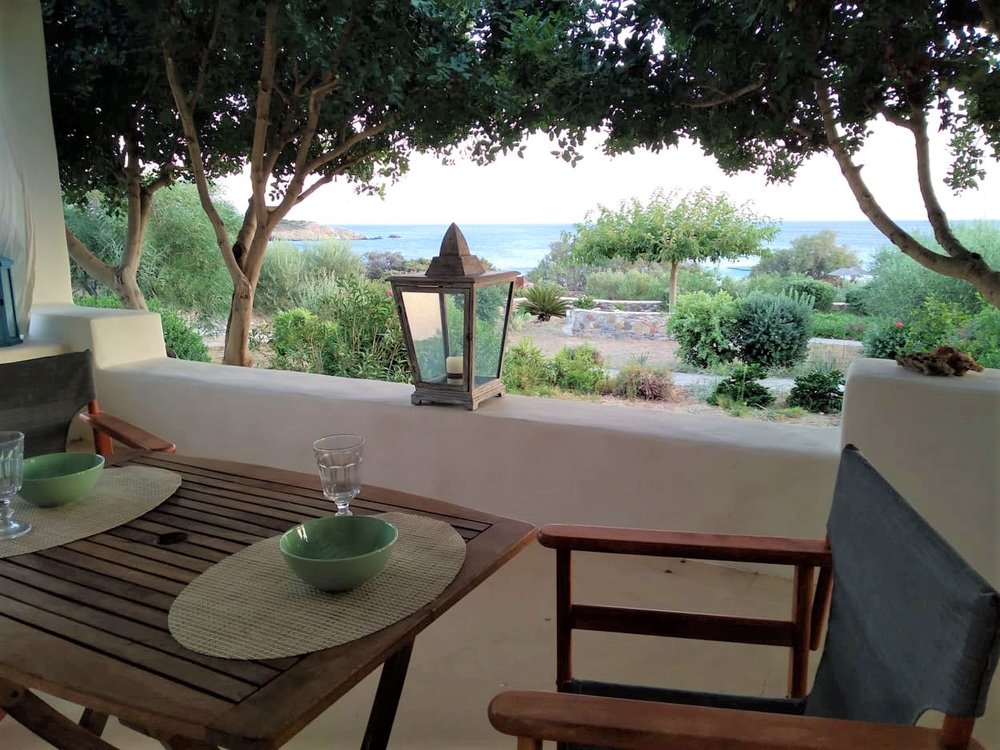 The villa has 2 bedrooms, one in each floor with ensuite bathroom, three beds in each openplan living room, a fully equipped kitdhen and three dining areas, one in the living room and the other two in the shaded terrace and balcony, both overlookin the sea. The house is surrounded by a spacious garden and offers exceptional views of the sea from its windows and terraces. Best feature is direct access at the sandy beach through the garden gate.